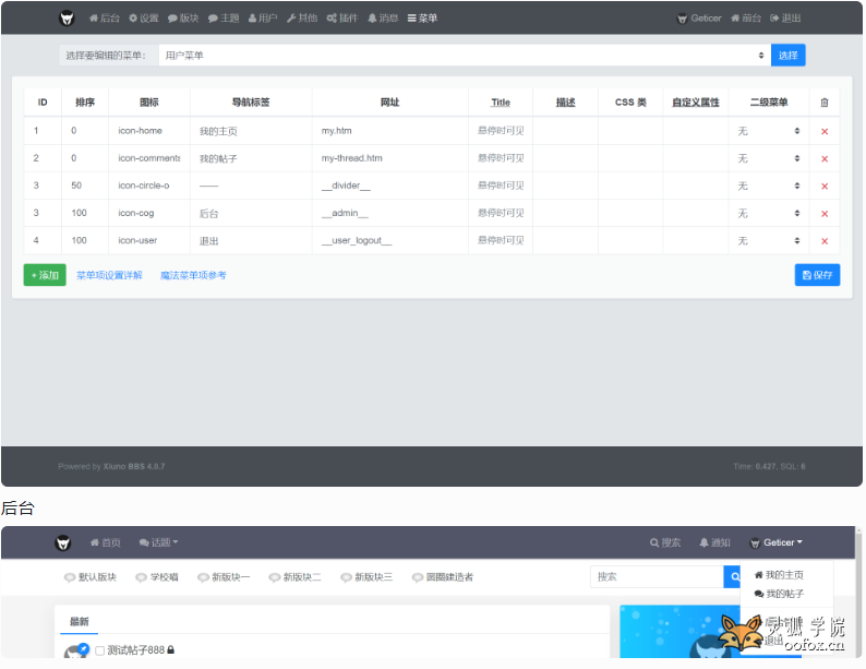 一站式管理各个导航菜单;轻松创建多级菜单;“魔法菜单项”让你轻松插入特殊菜单项,包括板块列表、用户菜单、登录按钮、发帖按钮等,省时省力;手动备份/恢复菜单项附赠几款适配版菜单,基本上实现开箱即用;如果主题要求使用本插件,请不要再安装本插件附带的“定制菜单”,只安装“菜单”插件即可使用,否则可能会产生冲突;本插件附带多种菜单,不代表必须全部安装并启用,只用自己需要的即可。